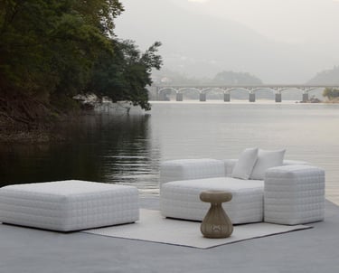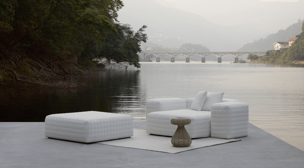 Pufes acolchoados e versáteis, com formas geométricas para dar forma aos espaços exteriores.