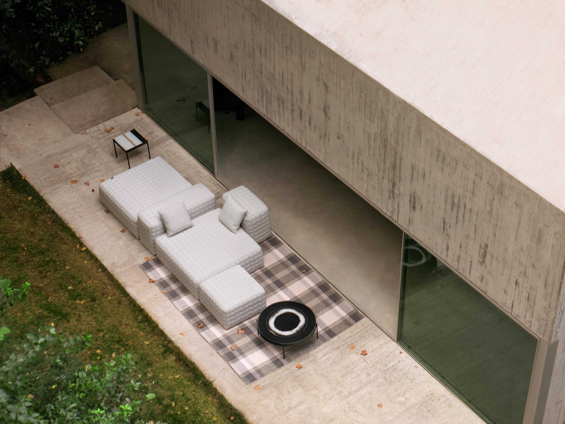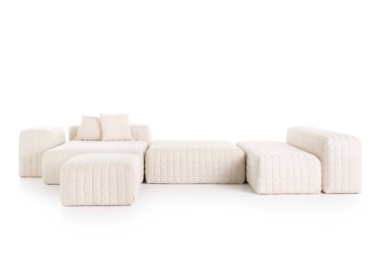 ERNO adapta o conceito de sofá para interiores também para uso externo. Trata-se de uma coleção de pufes versáteis, estofados em tecido acolchoado com padrão quadriculado, que se unem para criar diferentes configurações de assentos. A série é complementada por outras peças idênticas aos pufes, porém mais altas, que funcionam como apoios de braço e encostos. Além de proporcionar conforto, essas peças multiplicam as possibilidades de criar diferentes ambientes.